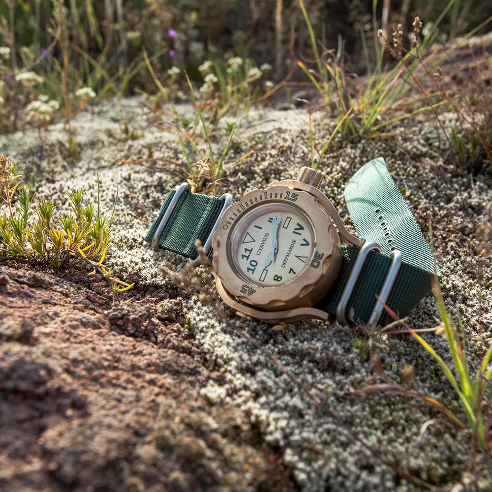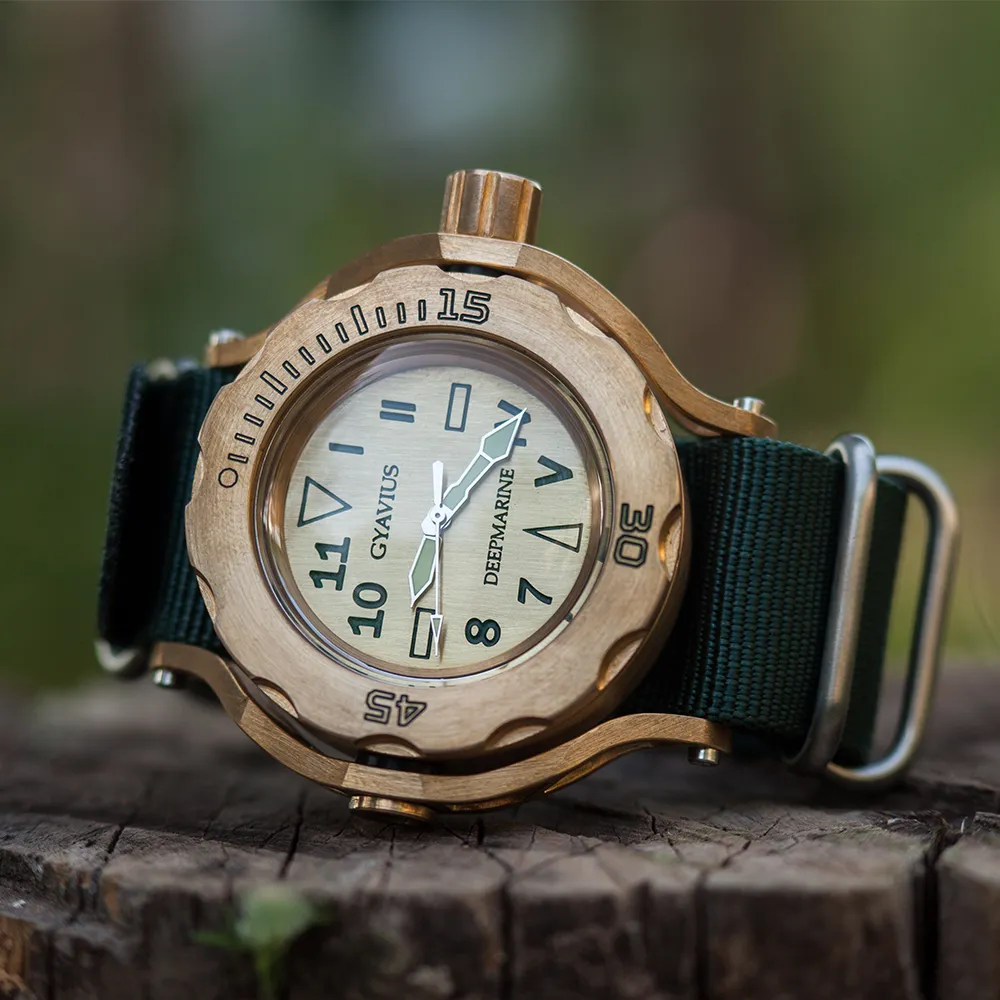 BezelSolid Bronze 60 click, uni-directional | CrownSolid Bronze Double sealed, screw down. |